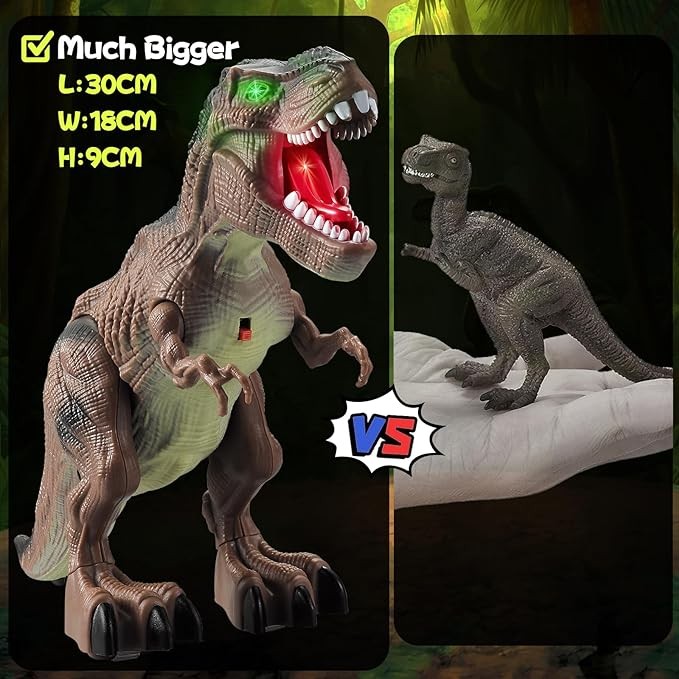 • Electric Dinosaur Toys: 2 Pack Dinosaur toys(dark green and brown)Simulated dinosaur appearance, detailed dinosaur skin texture.Dinosaur dimension:30*18*9CM.Electric dinosaur toys can emit roaring and walking sounds, emit different colors of light, and automatically walk. There are scooting wheels on the bottom to motorize the dinosaur to walk.When you load the batteries and press the button ,you can start exploring and enjoy the fun of this dinosaur toy.Requires 2 "AA" batteries (not included)