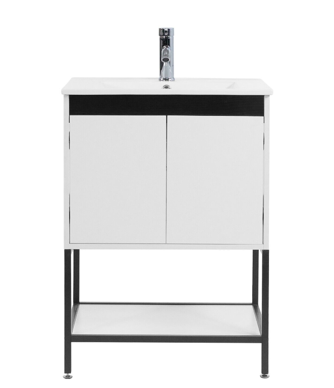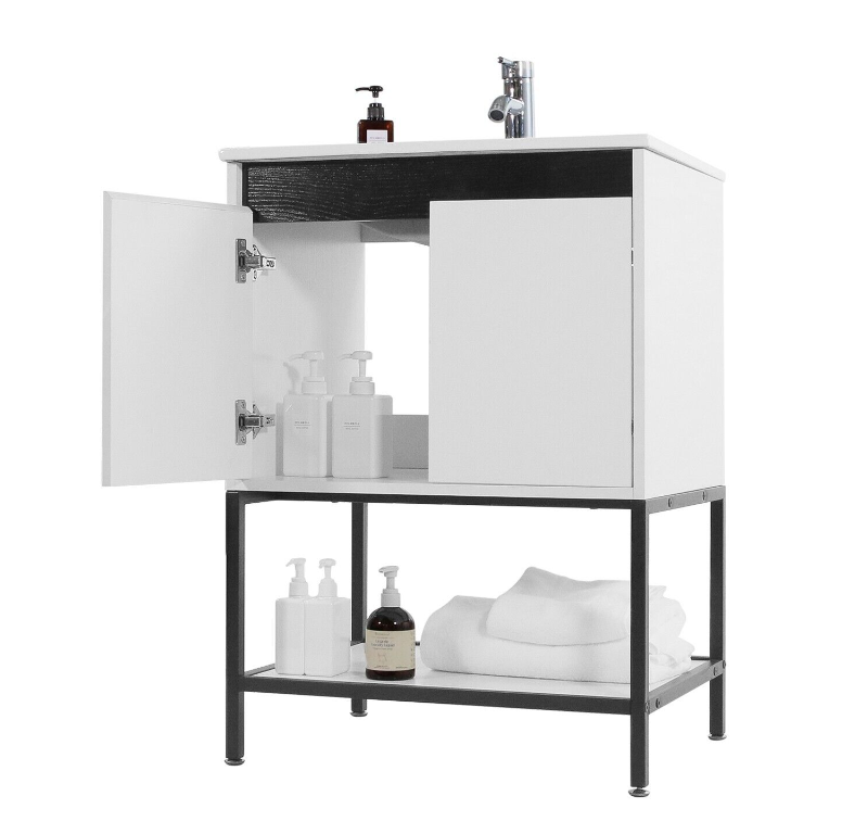 24" Bathroom Vanity White Cabinet Open Shelf Ceramic Sink Set Faucet Drain Combo