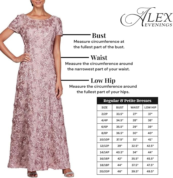 Sizes for Every Woman: At Alex Evenings, we embrace the beauty of every woman. Our inclusive sizing, from Petite to Regular, and Plus sizes, ensures that our dresses are designed to complement various body types. Find your perfect fit for any special occasion.
