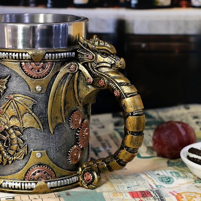• GUZZLING DRINK - This steampunk dragon mug is 5.7" tall, 6.65" long , wide 4.14",weighs 1.59 lbs. Can hold up to 21 ounces of your favorite cold beer, mead, wine, coffee, juice drinks or teas beverage. Nice cups to use during d&d gaming nights or a themed party.