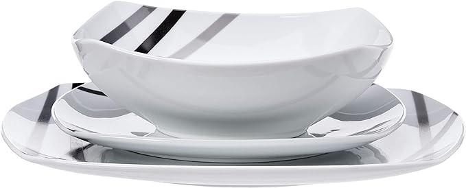 • Includes 6 each: 9.6-inch dinner plate, 7.5-inch salad/dessert plate, and 6.7-inch bowl
