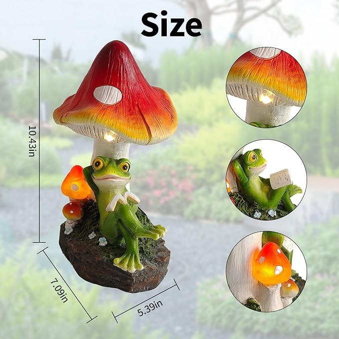 • ?Interesting Design: Cute frog leaned against the mushroom to read a book, an LED light directly above the book creating an atmosphere of reading, the frog solar garden statue is hand-painted with very nice details and bright colors. It makes your garden or yard look alive!
