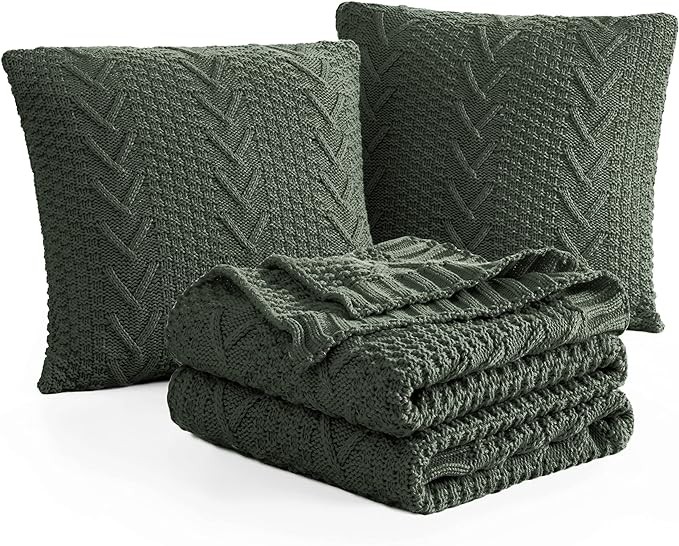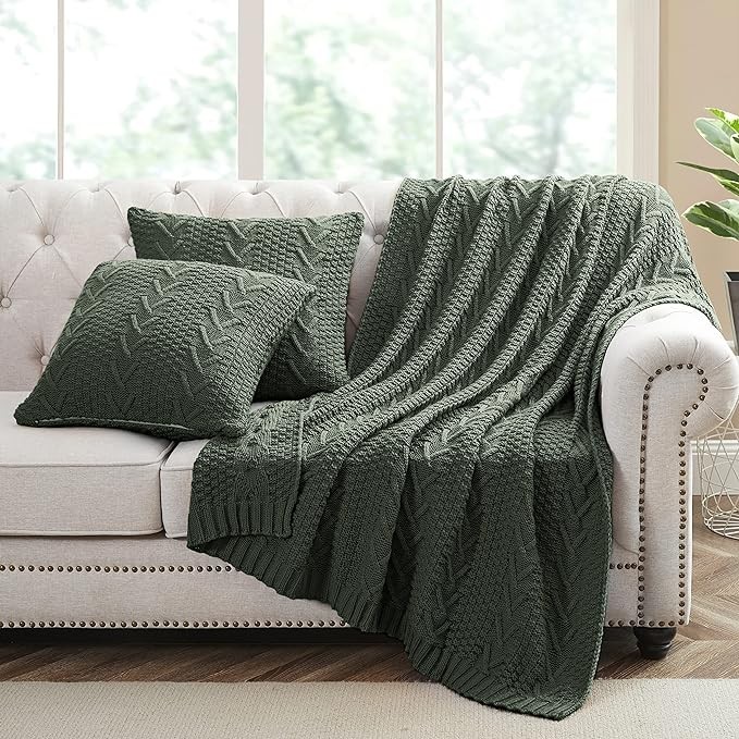 Aormenzy Knitted Throw Blanket (50" x 60") and 2 Pillow Covers (18" x 18"), 3 Piece Grayish Green Throw Blanket Set, Decorative Throw Blankets for Couch Sofa Bed Living Room