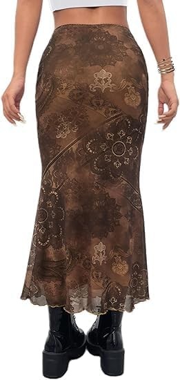 Avanova Women Boho Floral Mesh Mermaid Skirt High Waist Summer Fishtail Midi Skirt