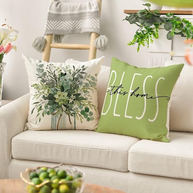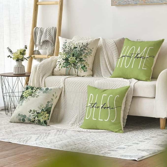 AVOIN colorlife Home Sweet Home Eucalyptus Leaves Green Throw Pillow Covers, 18x18 Inch Spring Summer Seasonal Decorations for Home Set of 4
