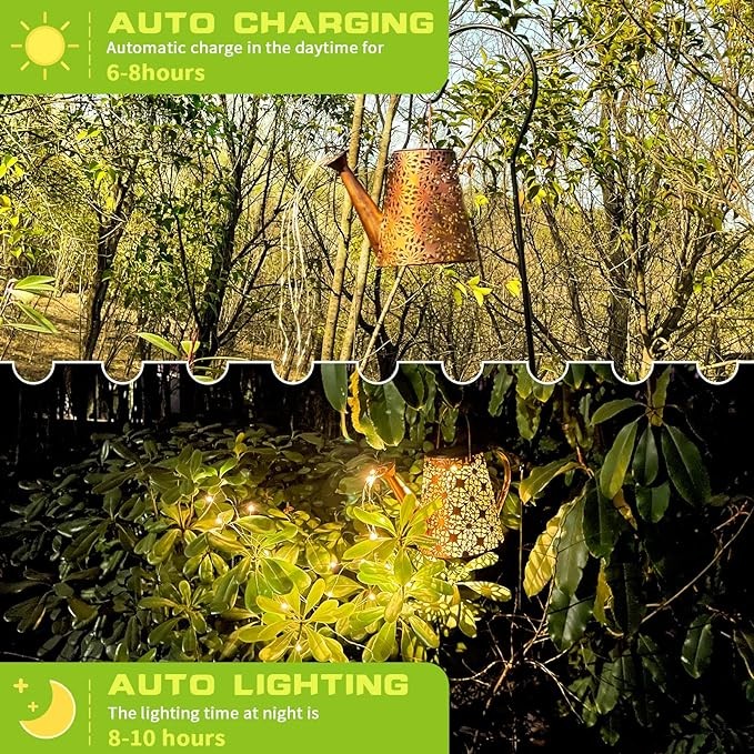 【OUTDOOR GARDEN LIGHTS】Our solar watering can light decor light collects sunlight during the day and lights itself up at night. It's like having a floating "kettle" in your garden at night that waters your flowers by itself.
