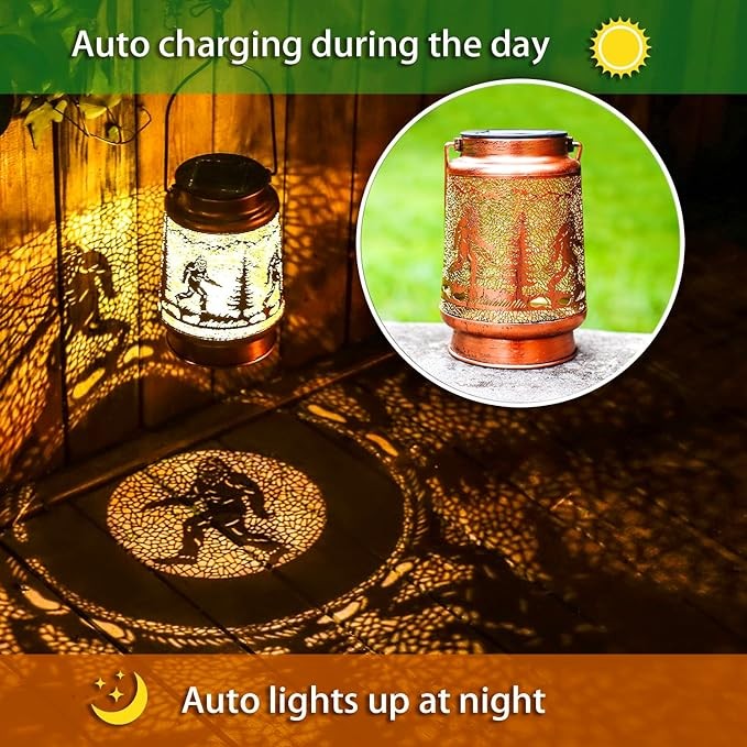 【Perfect Garden Decorations】- Bigfoot solar lantern can project unique and beautiful patterns in a dim environment, creating a gorgeous and warm atmosphere to bring life and fun to your garden and attract your family or friends. The unique hollow out design and beautiful antique bronze color give it an artistic touch, perfect for decorating gardens, backyards, corners, Outside, sidewalks and many other scenes.