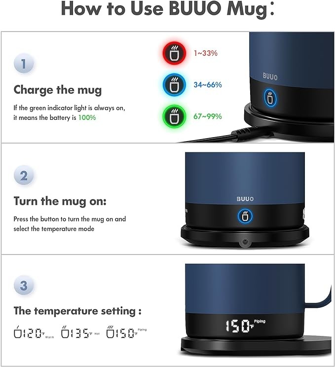 Simple One-Button Control with Left-Hander Friendly Double-sided LED Display: Press the button to turn on the mug and select the mode. Each time you press the control button, it will cycle through the temperature settings Warm/Hot/Piping on the mug, with the fourth press turning the mug off. The double-sided LED display flashes the mode you select and then shows the real-time temperature of the liquid inside. Even with your left hand, you can grab the real-time temperature on BUUO effortlessly.
