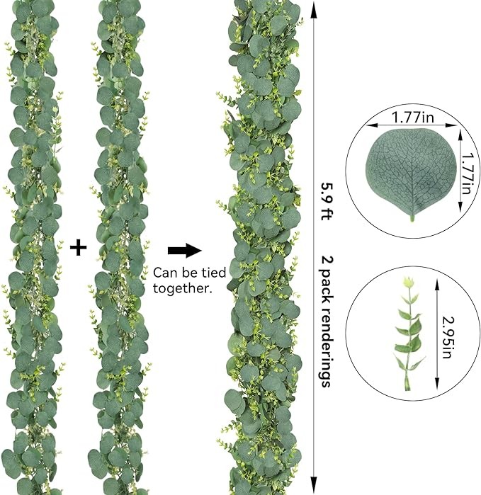 • DURABLE and REUSABLE: Sturdy and texture clear ivy leaf are made of fabric, stems are made of plastic, but looks like real fresh preserved eucalyptus garland which is lightweight,no wilting, fading or get easily damaged. and adapt to all kinds of weather.Eucalyptus garland does not require any sort of special care.
