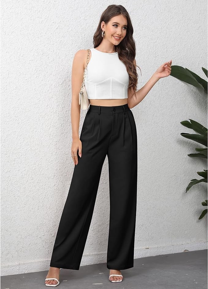 Style: Suit pants, Wide leg pants, High waist work trousers, Elastic back design, Button and zipper in front, Business work pants, Loose fit, Casual style, Wide leg pants with pockets.