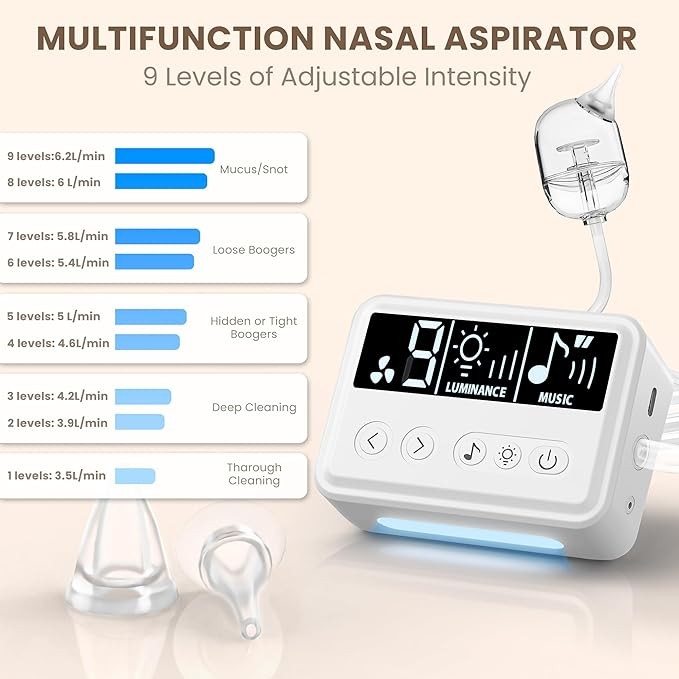 • 【9 Levels of Grade Suction】-A gentle yet powerful suction technology specially designed for tiny noses that clears nasal congestion comfortably so your baby gets instant relief without discomfort, reducing complications from prolonged congestion