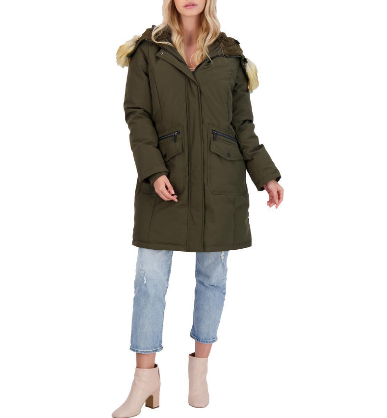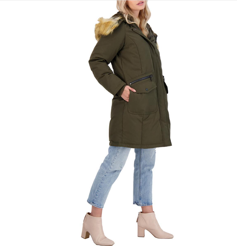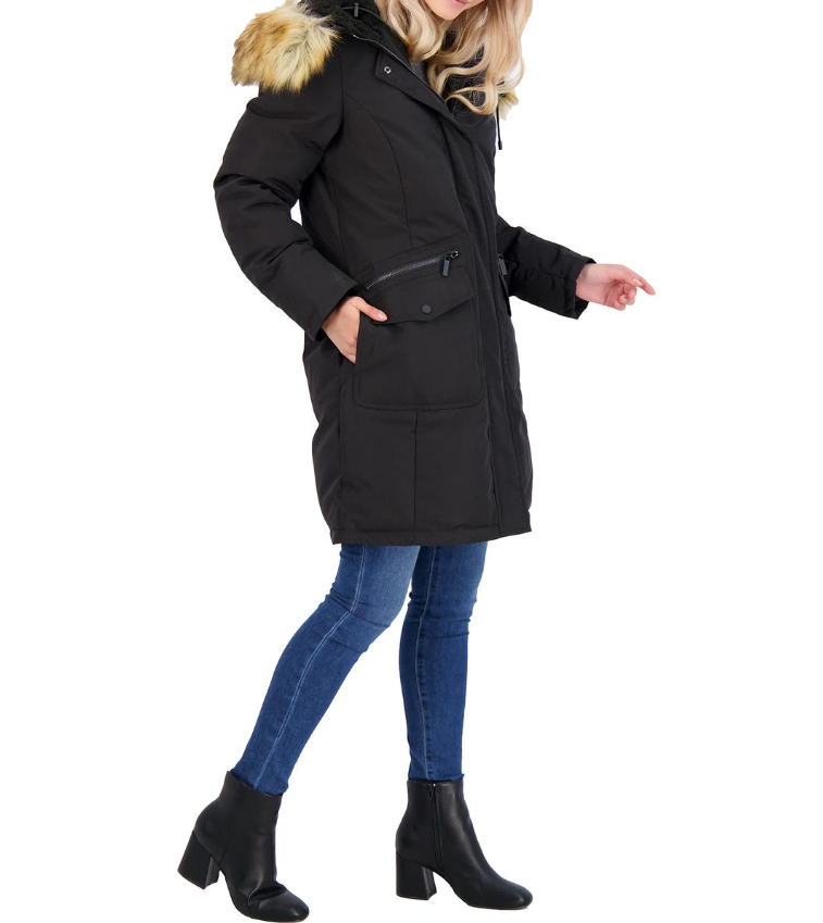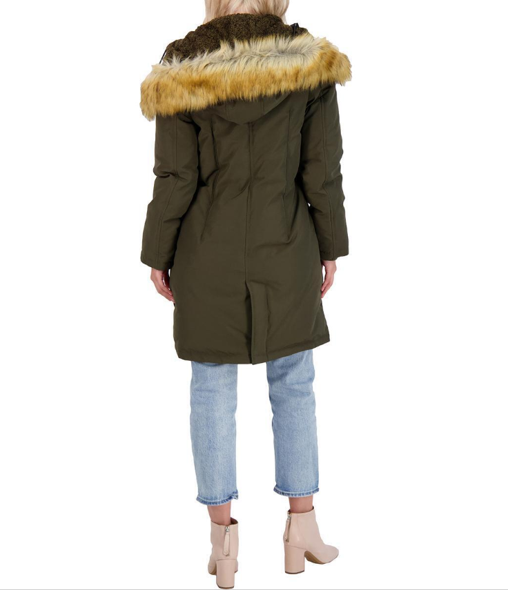 FRENCH CONNECTION WOMEN'S DOWN FILL MID-LENGTH PARKA WITH FAUX FUR TRIM HOOD