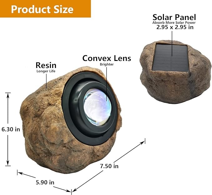 • 【IP65 Waterproof & All Weather Resistant】The solar outdoor spot lights are made of high-strength plastic material,they are water resistant, heat-resistant, and frost resistant. This solar rock light can work normally under different weather conditions, eg: rain, snow, frost etc.