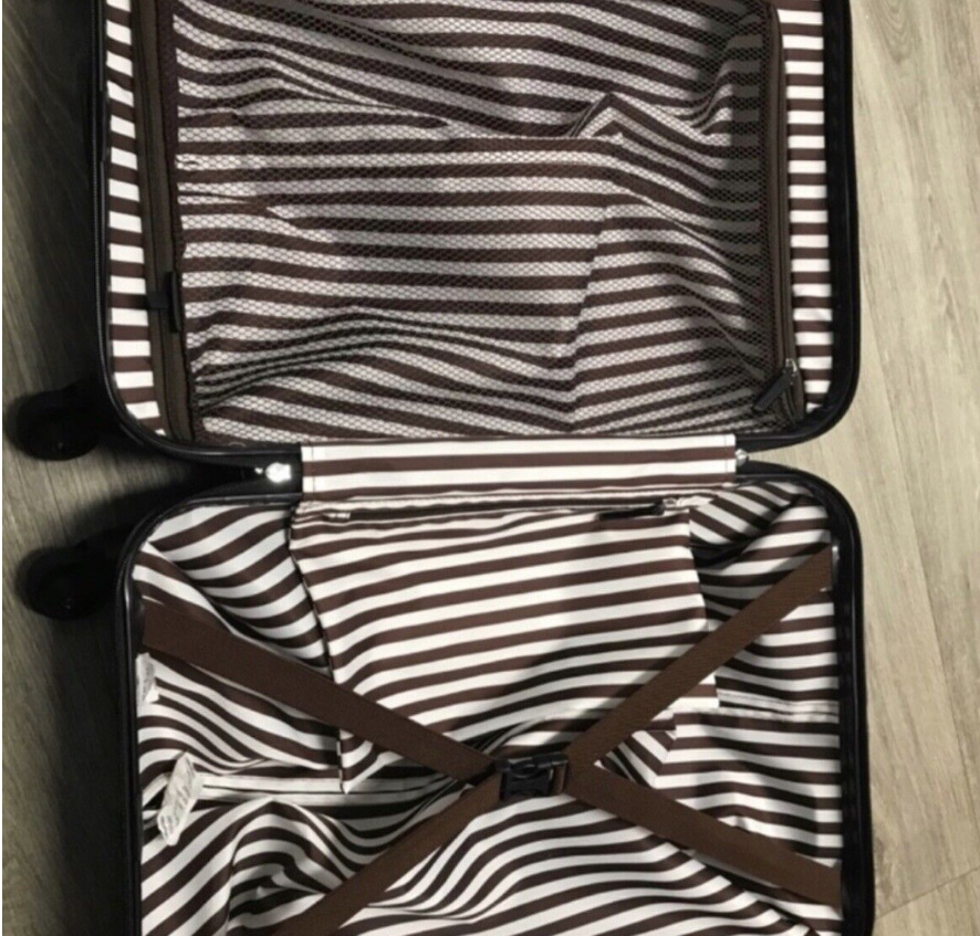 The design consists of mostly black with brown and white stripes. There are several compartments in this suit case, and comes with tags. This comes from a smoke- and pet-free home. This one has never been used!