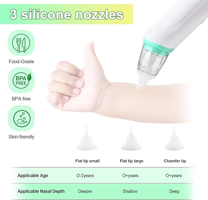 • SAFETY AND HYGIENE: 3 different shapes of food grade silicone suction nozzles, free of bisphenol A and latex, soft and hygienic.It does not damage the delicate nasal mucosa of infants and is suitable for use by children of different ages.