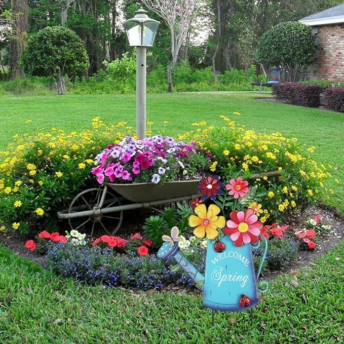 • ?【BRIGHT UP YOUR GARDEN】Bring the enchanting beauty of spring indoors with our exquisite garden stake. Crafted in the shape of a watering can, this stunning piece features an array of colorful iron flowers blooming on its surface, accompanied by charming ladybugs and butterflies. Adorned with the uplifting words "WELCOME" and "Spring," this piece not only adds a touch of elegance but also welcomes the fresh energy and vibrant colors of the season into your space.