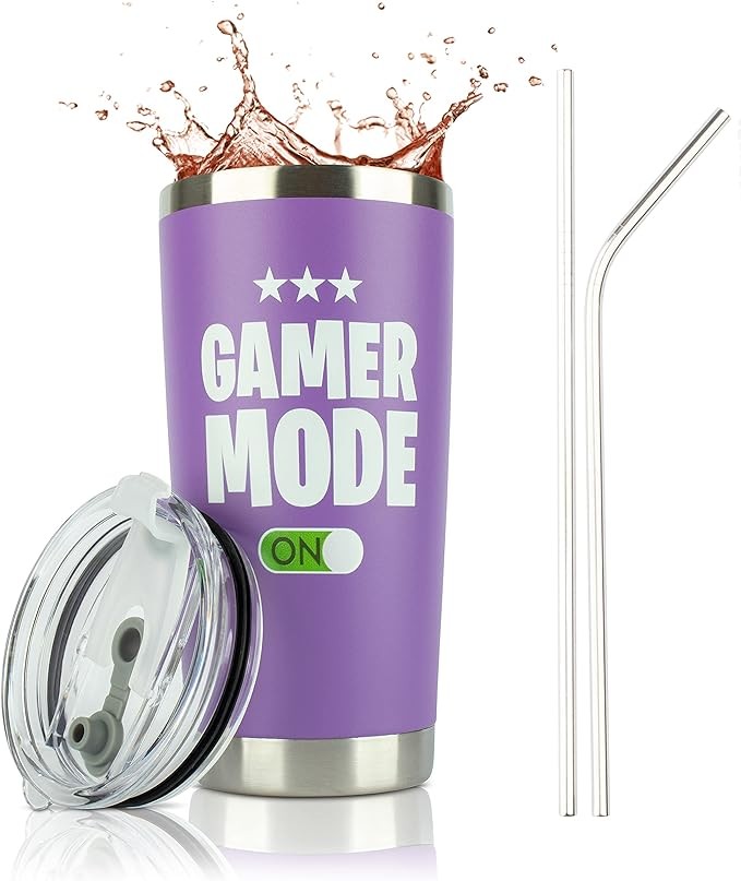 JENVIO Gamer Gifts for Men - Gamer Mode ON - Stainless Steel Tumbler for Coffee/Cold Drinks w Lid and 2 Straws | Gift Idea Gamer Cup - Video Gamer Mug Boys Valentine's Day Gift (20 Ounce Purple)