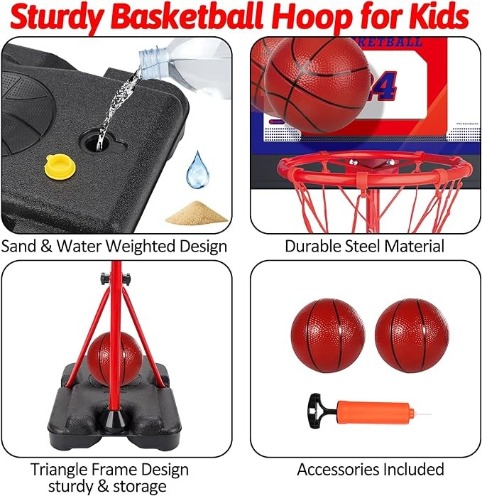 • 【Upgraded Adjustable Basketball Hoop】 Our kids basketball hoop come with 1 sturdy steel backboard, 2 vivid-color basketballs, 1 mini ball pump, 1 adjustable rim and other accessories. The height of the basket ball hoop can be adjusted from 3.5 ft -6.2 ft, grow with your aspiring youth players. Bouncy silent basketball dribbling indoor with textured surface is easier to grasp and play without disturbing your neighbors. Creative and portable basketball gear, gender neutral kids games 2-4-8.