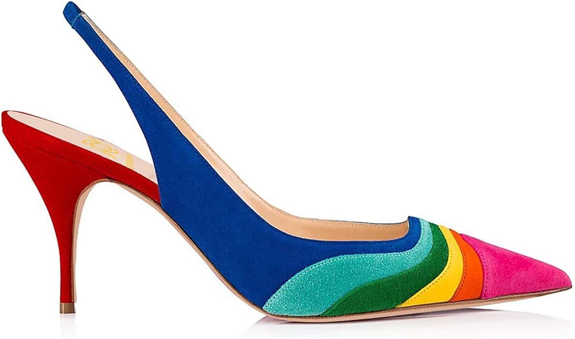 LEHOOR Women Rainbow Slingback Pumps Kitten Heels Pointed Toe Suede, Multicolor High Heel Pumps Stiletto Elastic Strap Closed Toe for Ladies Dress Party 5-13 M US