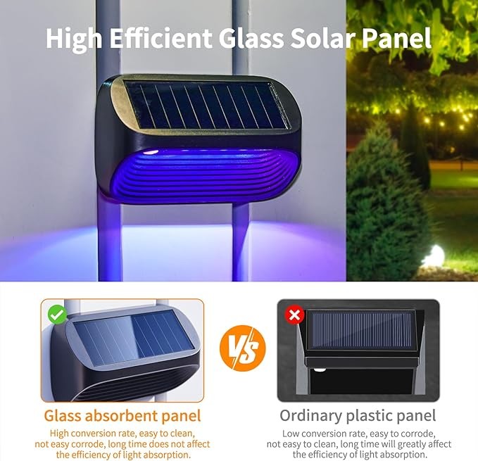 • 【Upgraded Tempered Glass Solar Panel】 Our fence solar lights adopt the latest cadmium telluride solar panel, which has a high light absorption rate and a conversion efficiency up to 25%. The solar fence lights also have a good performance even in low light and can be charged on cloudy days. These solar deck lights outdoor waterproof can stay lit for 10-12 hours at night after charging for 6-8 hours in the sun. Plus, solar panels of the solar lights for outside fence are easy to clean, won't corrode, and don't affect the light absorption efficiency over time. LETMY solar step lights will give your outdoor landscape a lasting and gorgeous lighting effect.