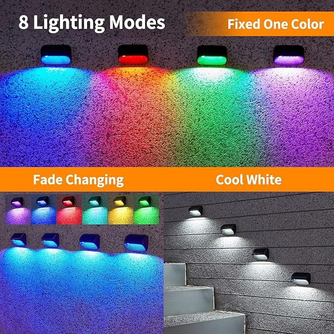 • 【8 Lighting Modes Solar Fence Lights】 LETMY solar fence lights outdoor provide 8 modes: Cool white, RGB Fade, and 6 Solid Colors. The solar lights outdoor multi-colored changing mode is perfect to meet your holiday or party decor needs. The cool white mode of fence lights solar powered is ideal for daily lighting. Most importantly, you can freely select and fix your favorite colors of the solar lights for outside, match the lighting colors and display them in your backyard.