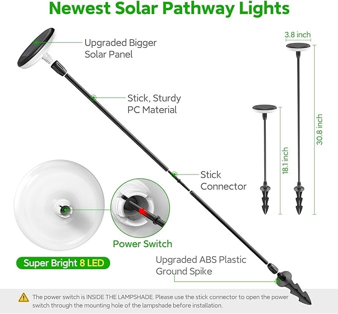 • 【34 Lumens High Brightness & Longer Lasting】The garden lights solar powered equipped with 8 high-quality LED beads, and the brightness reaches 34LM, which is much brighter than ordinary solar swaying lights on the market. Outdoor solar lights have a larger battery capacity 1000 mAh. The pathway lights solar powered can last for 8-14 hours after fully charged, working longer than other solar outdoor lights. Bright solar lights outdoor garden can provide a wonderful visual treat for you at night.