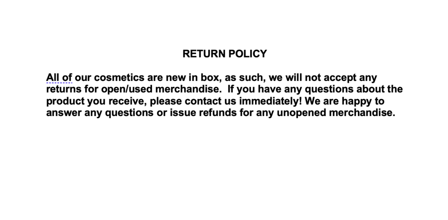 All our beauty products are new in box, as such, we will not accept any returns for OPEN/USED/TESTED merchandise. If you have any questions about color matching or shades, please contact us before you buy! We are happy to answer any questions or issue refunds for unopened/untested merchandise.