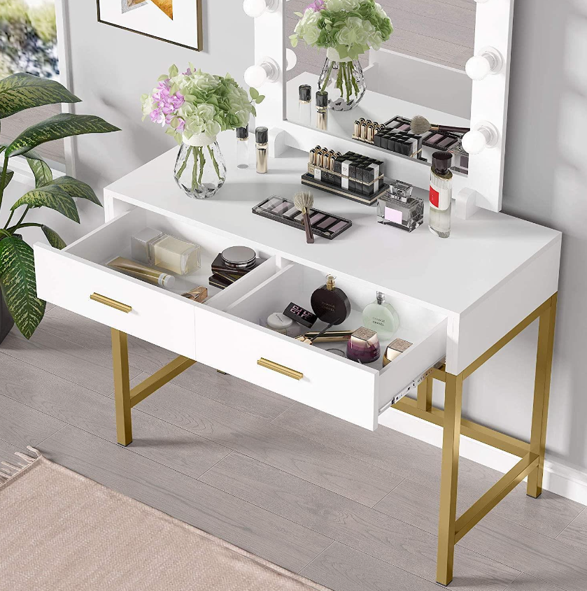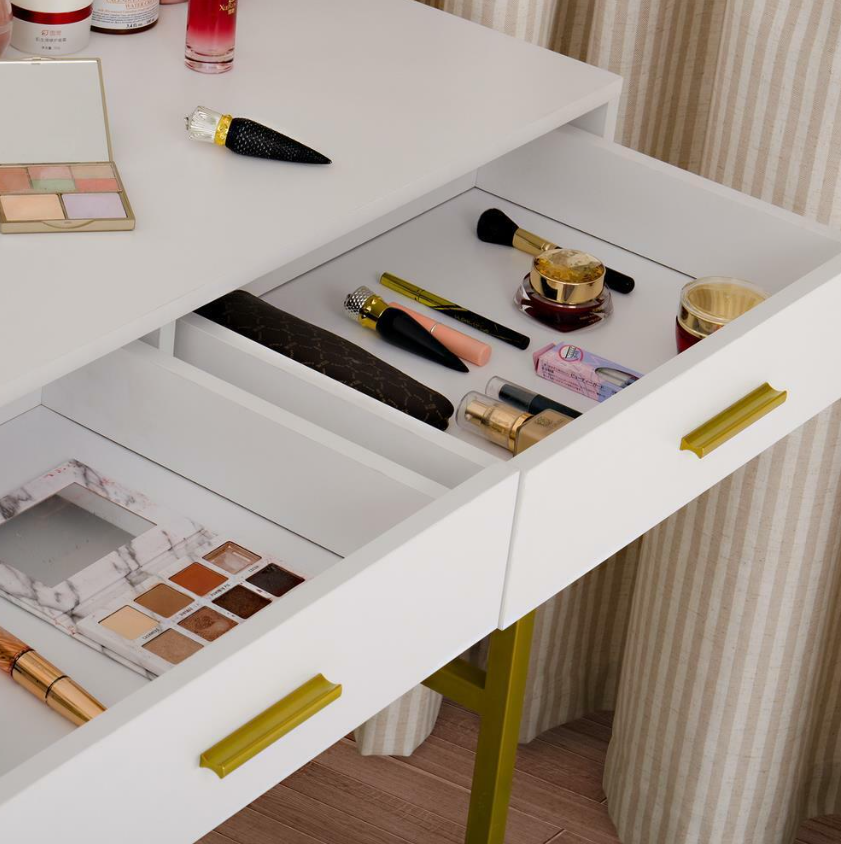 GALORE STORAGE SPACE: This makeup table features 2 big drawers for keeping all of your jewelry, makeup, and accessories corralled, while a large tabletop (39.7” L x 17.7” W) offers plenty of room to stage cosmetics, perfumes, and other frequently-used beauty essentials for quick and easy access.