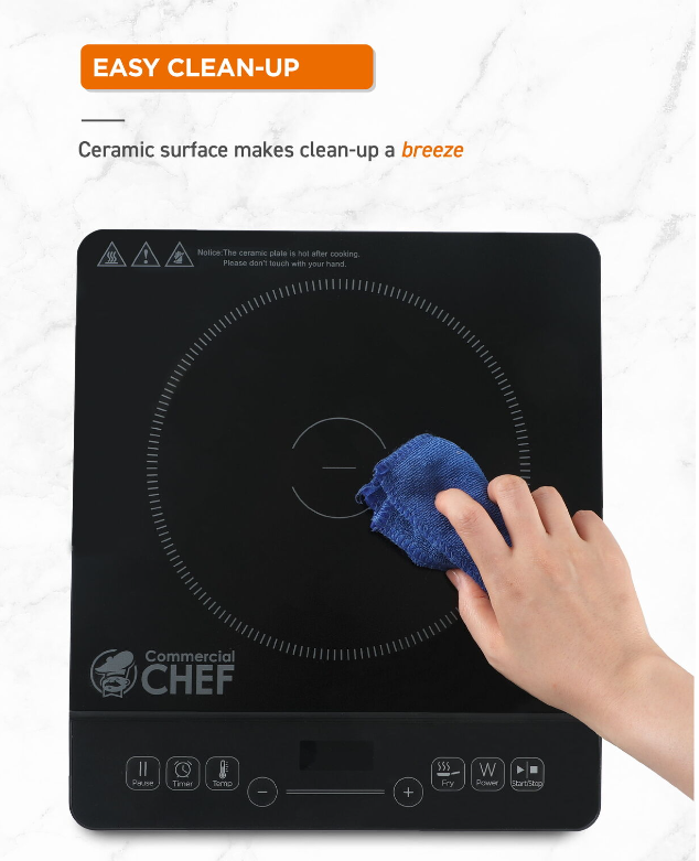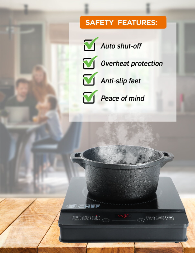 SAFETY FEATURES: This portable induction stovetop comes with a convenient 3-hour timer and automatic shut-off for ease of use and peace of mind. Overheat and container protection with voltage warning system included. Induction cook top is UL certified with ceramic surface for easy cleaning.