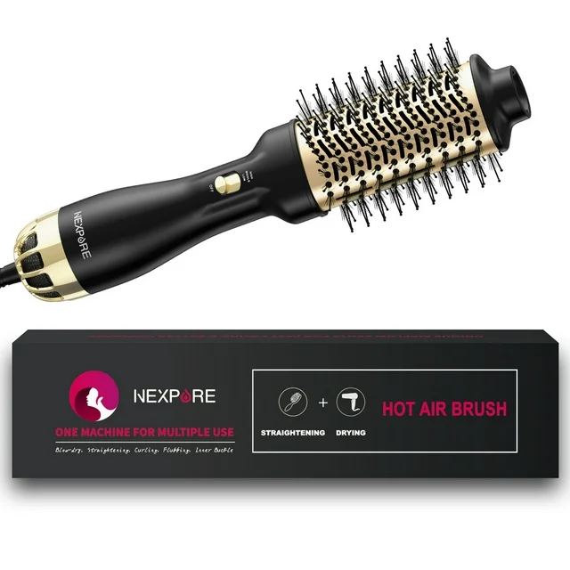 The Nexpure one-step hair dryer and volumizer is a designed hot air brush to deliver gorgeous volume and brilliant shine in a single step. The unique non detachable oval brush design smooths hair while the rounded edges quickly create volume at the root for beautifully full-bodied bends at the ends in a single pass. The brush is designed with nylon pin and tufted bristles for detangling, improve volume and control. Styling flexibility with 3 heat/speed settings and a cool option. Built to provide just the right amount of heat. Unlike conventional hair dryers, this volumizer can be placed closer to the scalp for lift. Boosted by ionic technology through a built-in genuine ION generator, hair dries fast and helps reduce heat damage.