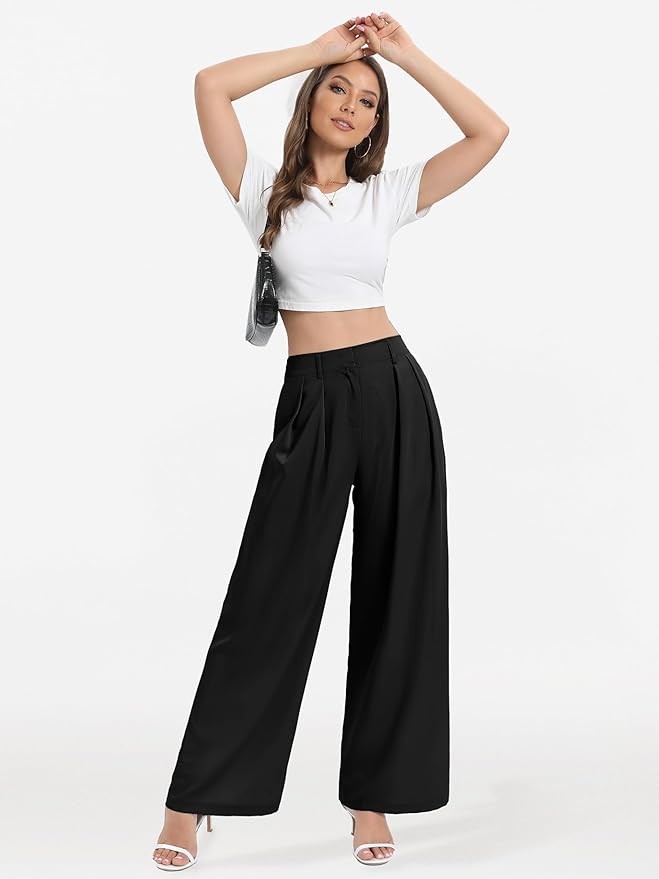 • STYLISH & UNIQUE DESIGN: Womens high waist wide leg trousers pants features a zip closure with hook and eye in the front, elastic back, drape design, easy to put on and take off. The front pleats add a fashion sense. The loose flowy wide leg palazzo pants can make you look more atmospheric, modify the imperfect leg shape, and hide the belly fat, making the body looks very slim. Two side pockets are deep enough to hold your phone and wallet, free your hands.
