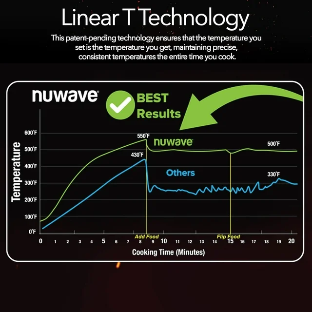 Fast Preheating: Little to no preheating time, from frozen to golden in minutes! Create gourmet meals with the versatility of a temperature range of 50°F to 500°F adjustable in precise 5°F increments for customized dual zone surround cooking.