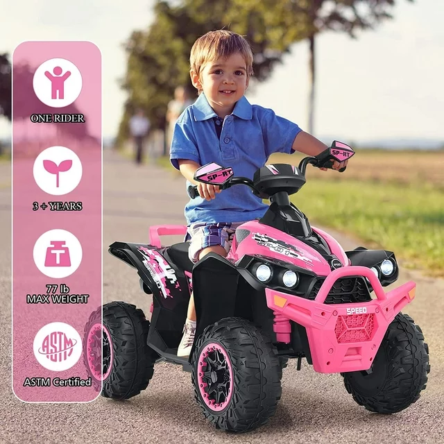 OLAKIDS Kids Ride on ATV, 12V 4 Wheeler Quad Toy Vehicle with Music, Horn, High Low Speeds, LED Lights, Electric Ride On Toy, Battery Powered Wheels Car for Kids Over 3 Years Old (Coral)