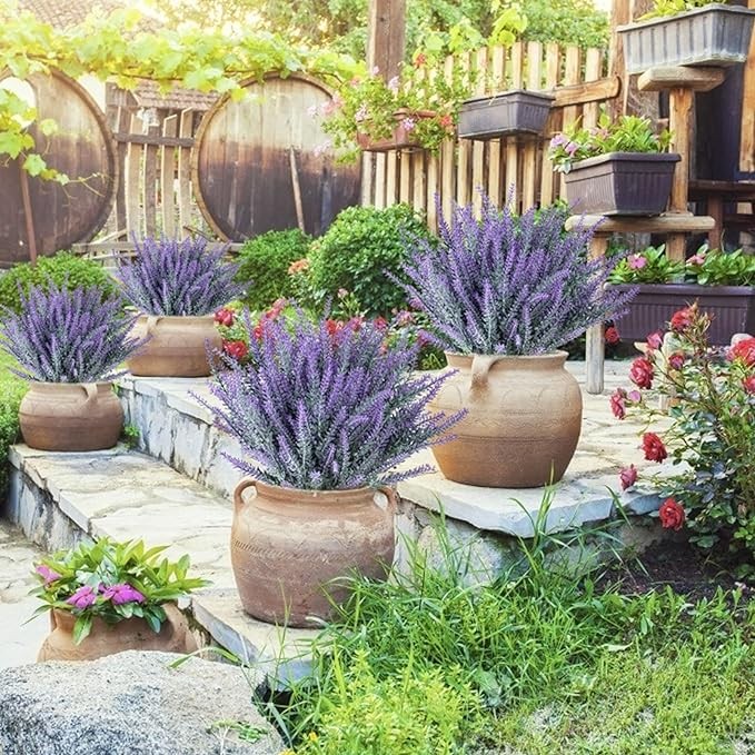 Artificial flowers for Decoration- Artificial lavender is ideal as wedding bouquet, home office wall shelf decoration, party supplies table centerpieces arrangement and festival decor. "Plant" these uv resistant lifelike lavender flowers on the front porch, backyard, front yard, garden, balcony, window sill, indoor outdoor. Artificial flowers for outdoor can live anywhere and don't need care or feeding and won't wilt!