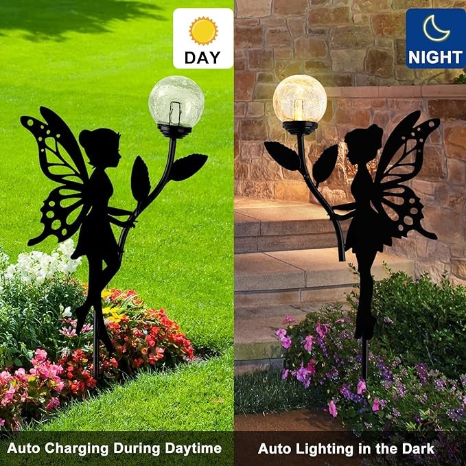 • Unique Fairy Garden Decor - The solar garden lights outdoor feature a captivating design, the cute standing fairy statue holds up a crackle glass globe which will illuminates your garden, adding a touch of whimsy and charm to any outdoor space. Each fairy is 11.02 inches tall and 7.67 inches wide.