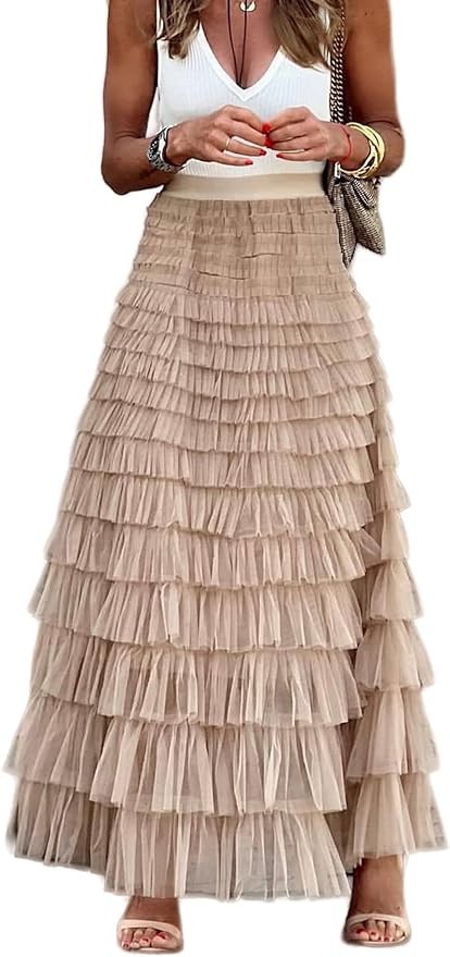 • Layered tiered mesh skirt for women, featured elastic waistband, high waisted, a line, flowy long pleated skirt.