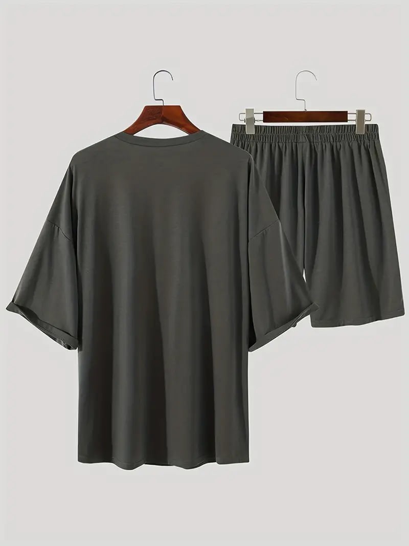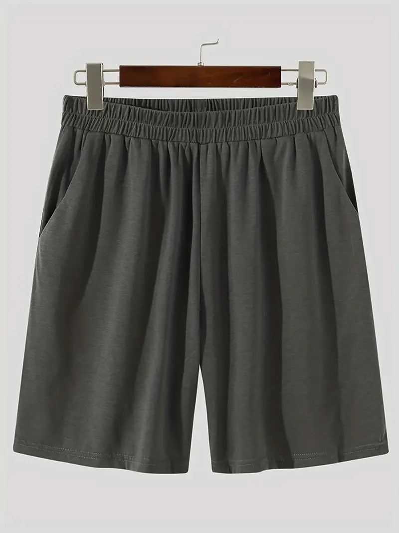 Plus Size,Men's Trendy Solid Crew Neck Short Sleeve T-shirt & Loose Shorts With Pockets Home Pajamas Sets, Casual Sets For Summer