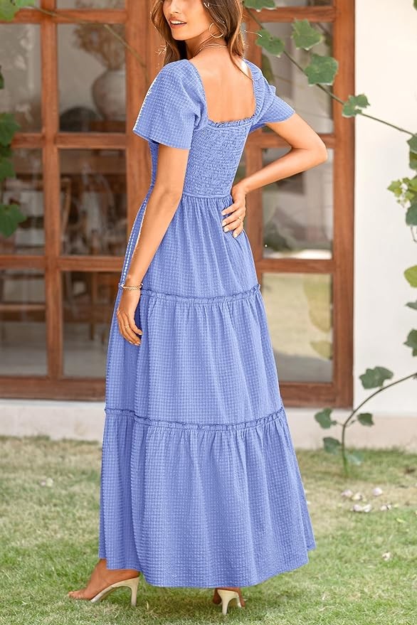 • FEATURES: Square Neck Maxi Dress For Women/ Casual Summer Dresses For Women/ Smocked Boho Dress For Women/ Short Sleeve Beach Dress/ Flowy A Line Dresses For Women/ Elegant Tiered Dress Women/ Ruffle Vacation Dresses For Women/ Womens Summer Clothes/ Going Out Dress