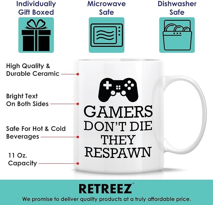 Retreez Funny Mug - Gamers Don't Die They Respawn 11 Oz Ceramic Coffee Mugs - Funny, Sarcastic, Sarcasm, Motivational, Inspirational birthday gifts for husband, boyfriend, friends, coworkers