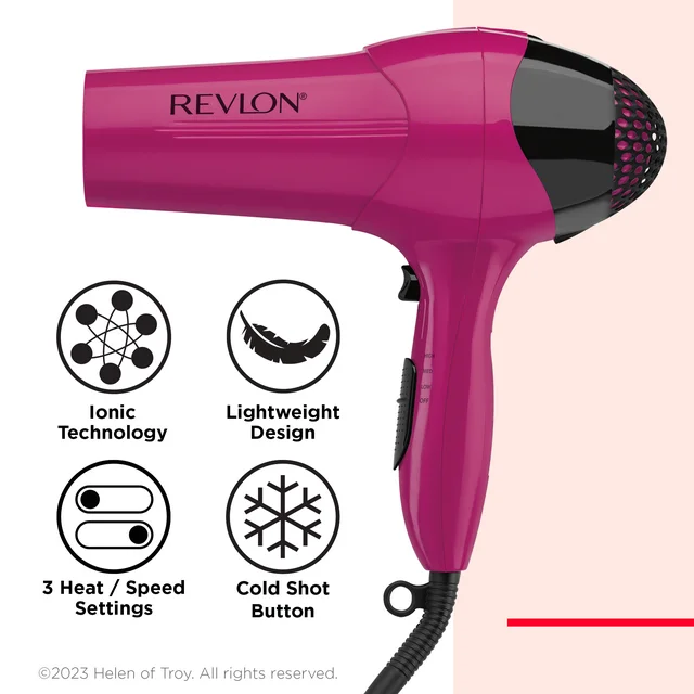 Dare to be new kind of bold with Revlon Hair Tools. Whether you're after salon-style blowouts, one-of-a-kind waves and curls, the perfect hair accessory, or you want to reinvent your style, Revlon has the tools to take your hair where it's never been before. This ultra-lightweight design features static-eliminating, frizz-fighting ions to deliver silky, smooth blowouts. This hair dryer is equipped with 3 heat and speed settings for styling versatility to achieve the look you love. Plus, added Concentrator attachment gives you maximum precision. With hanging ring for easy storage. Dare to go there with Revlon Hair Tools.