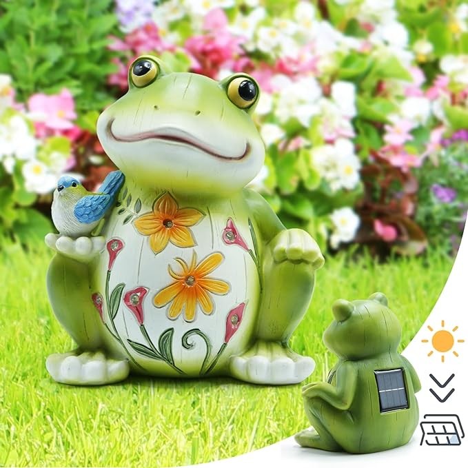 REYISO Frog Decor with Solar Light, Resin Garden Statue for Passage Yard Lawn Patio Spring Home Decor, Outdoor Decor Housewarming Surprise Frog Gifts for Mom, Women for Mothers Day