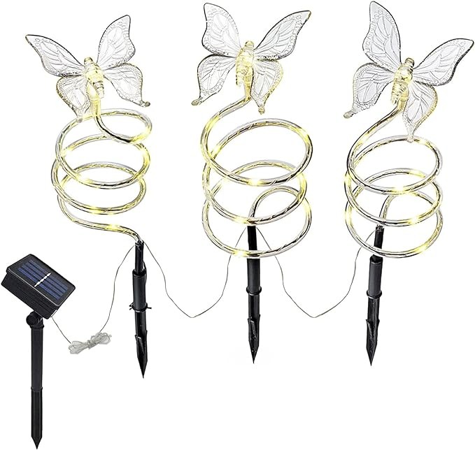 【Eye-Catching Spiral Garden Stake Lights】These set of 3 solar garden stakes with 30 vivid LED and butterfly figurines. Bright LED bulbs will light up automatically in the night and illuminate with a full charge in the sun. The solar garden lights will mesmerize you when butterflies shine through their bodies.