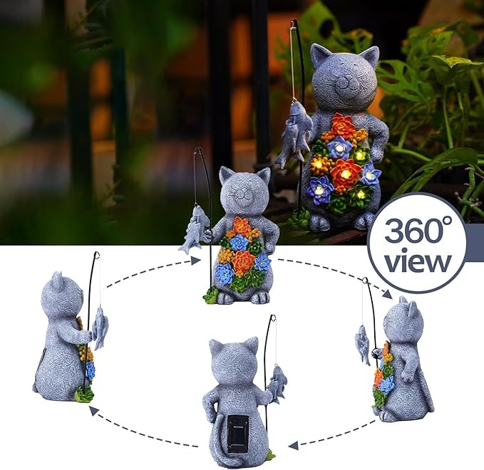 • 【Be different from others】Our cat statue has a fishing look, and the flowers on the cat will glow at night, adding a beautiful shape to your garden and making your yard even more attractive