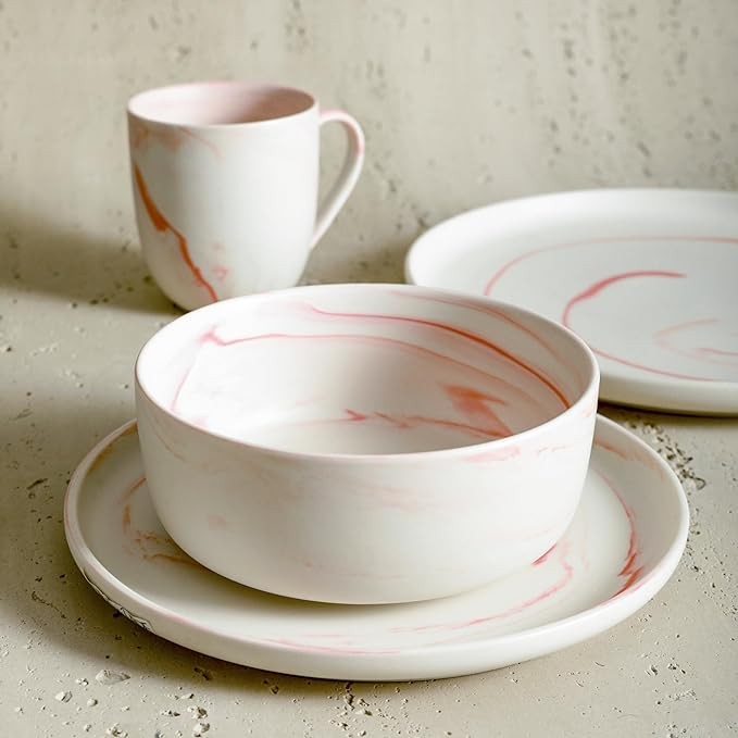 16 Piece Dinnerware Set – Cool pink porcelain dining sets. Trendy design. Includes 4 round dinner plates, 4 salad plates, 4 bowls and 4 mugs.