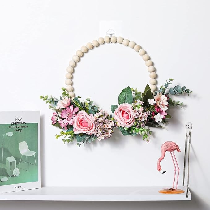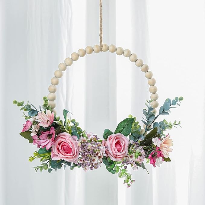 SWTHONY 13.8 Inch Spring Floral Wreath Boho Wall Decor – Hanging Wood Beads Fake Rose Flower Garland Farmhouse Wreath for Front Door- All Season Indoor/Outdoor Door Wreath and Window Decor