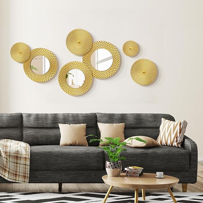 TEIPAI Gold Mirror Wall Decor for Living Room Porch Hallway, 7PCS Gold Metal Wall Art for Bedroom Decoration, Mandala Boho Decor for Office Dining Room Apartment New Home Gift