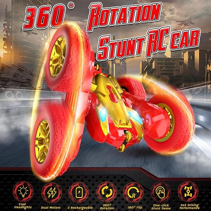 • ?Terucle UPGRADED REMOTE CONTROL CAR: Based on the Terucle Stunt RC Car's 2024 NEW red and gold design, you can do full 360-degree drifts, delivering the thrill of drifting to every gameplay session. This sturdy and durable RC vehicle toy is built for double-sided racing, allowing it to flip and race on both sides to pass obstacles easily.