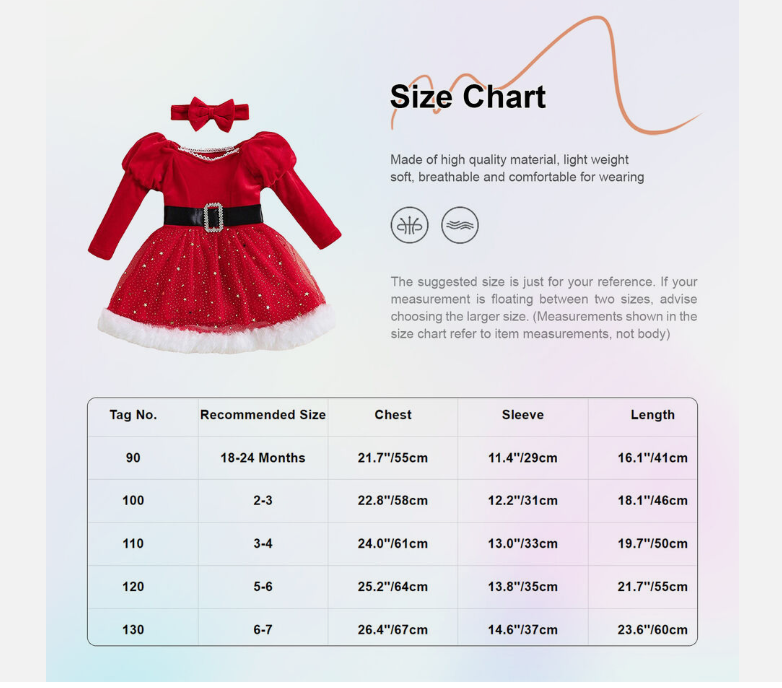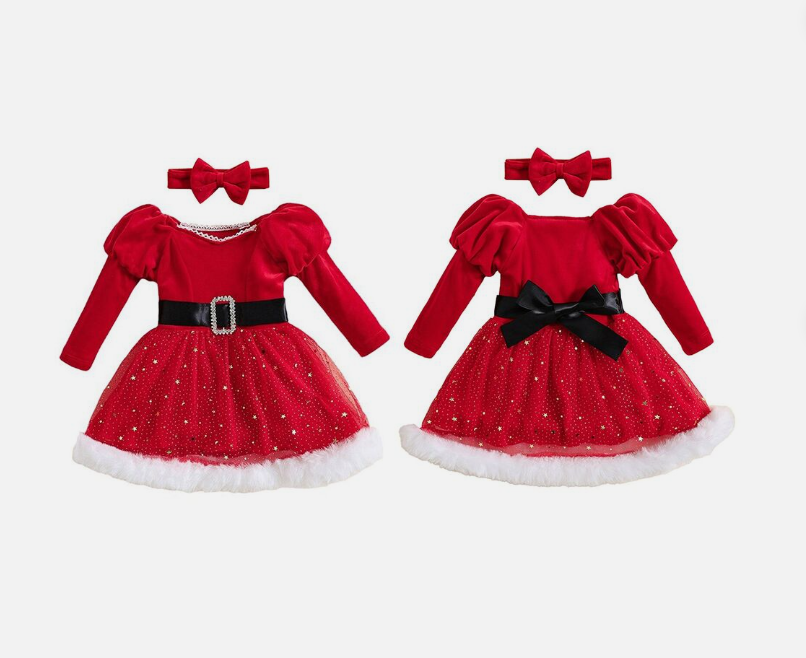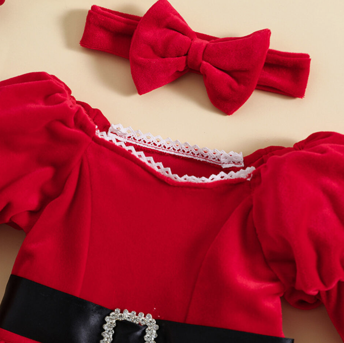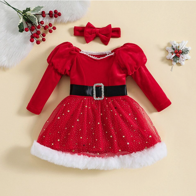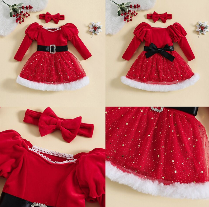 A Santa claus red velvet princess dress with a headband for girls, perfectly fit Christmas or New Year parties.