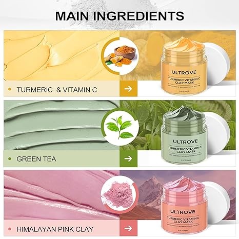 • 【ULTROVE CLAY MASK SET】Turmeric Vitamin C Clay Mask, Green Tea Clay Mask and Himalayan Mud Mask are combined into a set of 100g bottles each with a total weight of 300g, including a silicone mud mask brush. They focus on deep pore cleansing and restoring clean and moisturized skin, ideal for facial skin clay mask care.