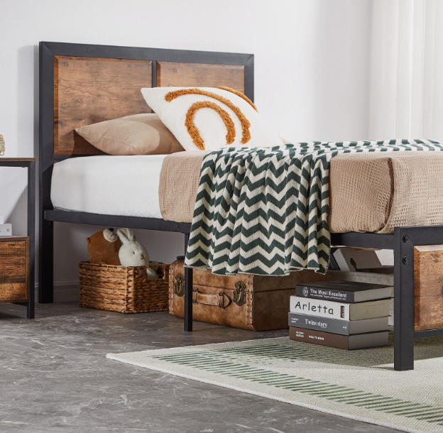 ² Sturdy and Stable】This bed frame is composed of 9 legs and 14 pieces of heavy-duty steel slats, the unique industrial wood grain headboard and footboard add better support to your mattress.